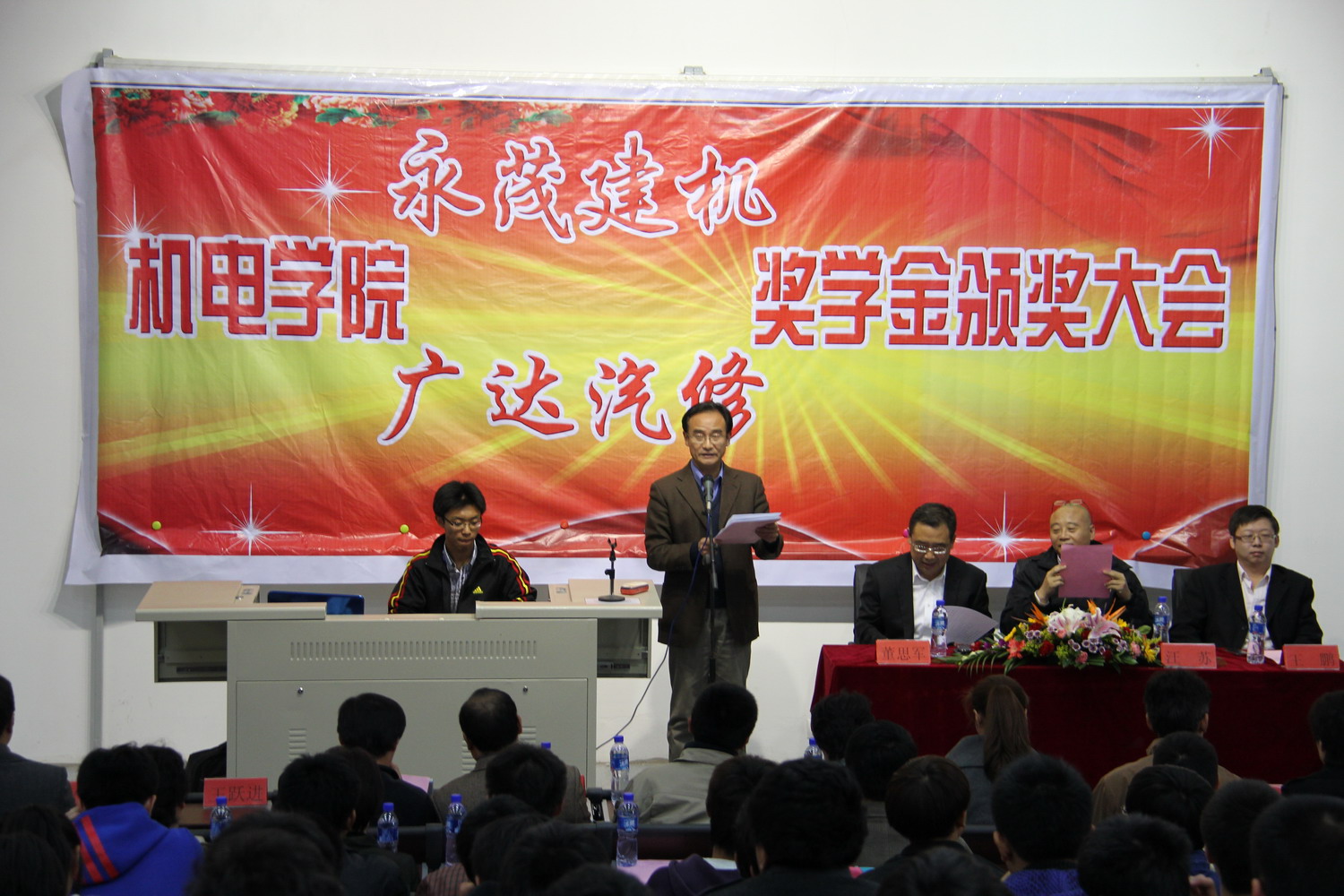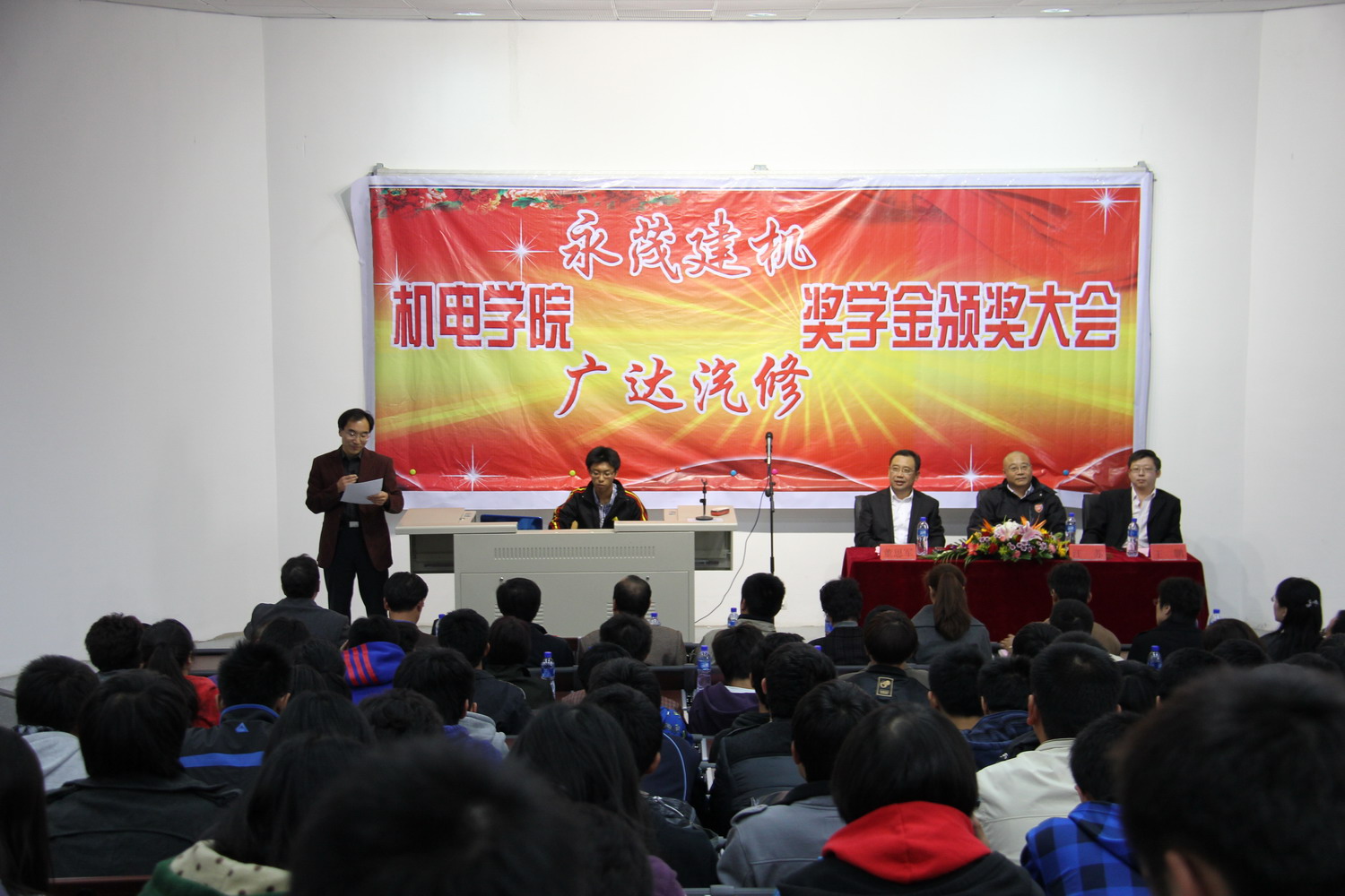 10月28日,机电学院永茂建机、广达汽修奖学金颁奖大会在大兴校区学A报告厅举行。副校长兼机电学院院长汪苏、永茂集团常务副总经理兼北京永茂建工机械制造有限公司执行董事董思军、北京永茂建工机械制造有限公司总工程师杨金萍、北京永茂建工机械制造有限公司人力资源部经理王云飞、北京广达汽车维修设备有限公司总经理王鹏、北京广达汽车维修设备有限公司总经理助理金凤波、机电学院党总支书记王跃进、学校教务处副处长邹积亭、学生处副处长魏强、文法学院副院长刘国朝、机电学院副院长陈宝江、机电学院党总支副书记李云山、文法学院教师陈品、朱姝、机电学院全体班级导师,获奖同学代表以及机电学院全体10、11级同学参加了大会。大会由李云山老师主持。
