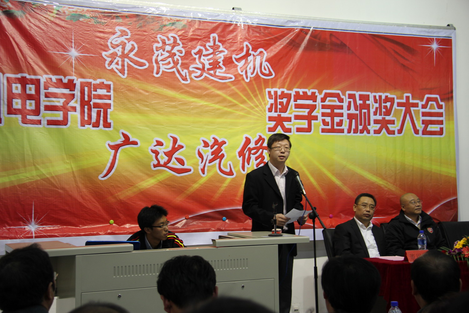 在隆重和热烈的氛围中,大会正式开始。机电学院党总支书记王跃进和机电学院副院长陈宝江分别宣读了永茂建机奖学金和广达汽修奖学金的表彰决定,共表彰2010/2011学年获得英语学习个人优秀奖学金、综合一等奖学金、综合二等奖学金的本科生、研究生共74人,此外还表彰了永茂建机就业奖获得者2人,英语学习班级优秀奖两个(工业091和机094)。