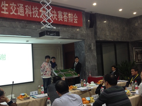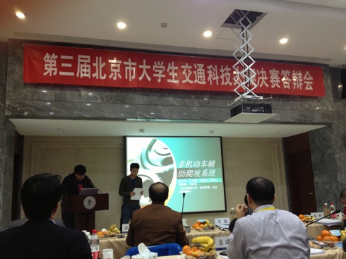 11月24日,我院学生在机电学院团总支书记刘星老师的带领下参加了在北京交通大学举办的“第三届北京市大学生交通科技大赛”。学校共有两组作品参赛,分别是代文鹏、季旭武等同学完成的作品《分层式十字路口》(指导教师:朱爱华老师),王文腾、白景宸、魏祎聪等同学完成的作品《非机动车辅助爬坡系统》(指导教师:姚圣卓老师)。经过激烈的答辩和模型展示环节,两组同学均获得大赛三等奖。