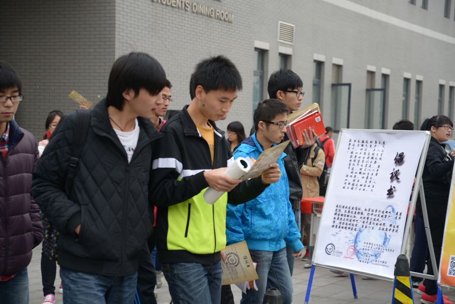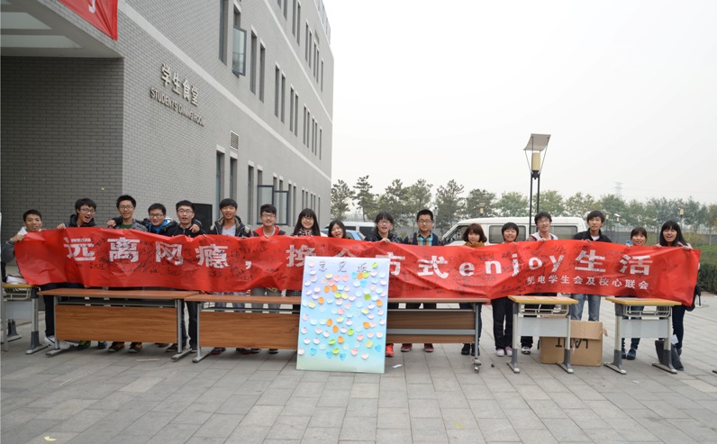 11月5日中午,大兴校区食堂北门排起了长长的队伍,很多学生低着头在条幅上聚精会神地签着自己的名字,还有的同学拿着宣传单在仔细阅读,旁边的宣传板上已经贴满了写着个人箴言的小贴纸——这是机电学院学生会与校心联会共同组织的“珍爱生命,远离网瘾”心理健康教育活动现场。活动内容包括发布戒除网瘾倡议书、填写个人箴言和心理讲座三个环节。这种新型戒除网瘾的宣传形式激发了同学们的兴趣,也收到了很多如何戒除网瘾的好建议,场面热闹非凡。