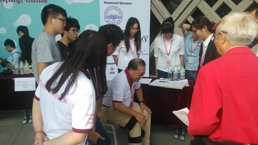 经过前期选拔,共有六支来自东北亚地区高校的优秀参赛队伍参加本次大赛,各大高校的机械设计高手们纷纷拿出绝活,在赛场上展示风采。宁波诺丁汉大学设计的康复带能够为中风病人四肢的康复提供针对性的帮助;中国农业大学设计的作品能在中风患者坐下和站立时给予有力的支撑,是普通拐杖的一个革新;澳门大学设计的“生命之手”能使中风患者的手臂与普通人一样便利;华南理工大学广州学院设计的作品能够有效帮助偏瘫患者避免肌肉萎缩,治疗中风病人的后遗症;北京信息科技大学带来了能够帮助中风病人进食的机器人;我校设计的作品“i Bath”能够帮助中风病人洗澡,极大提高病人的生活质量。在陈述环节,参赛队用精美的ppt、逼真的动画视频向评委展示了设计理念和作品的机械原理;在问答环节,评委老师们专业犀利的提问和同学们沉着精彩的回答相互碰撞出思维的火花,带来了一场科技与智慧的盛宴;在实物展示环节,参赛队向评委演示了实物模型,精美的作品吸引评委和参会人员纷纷驻足观望。