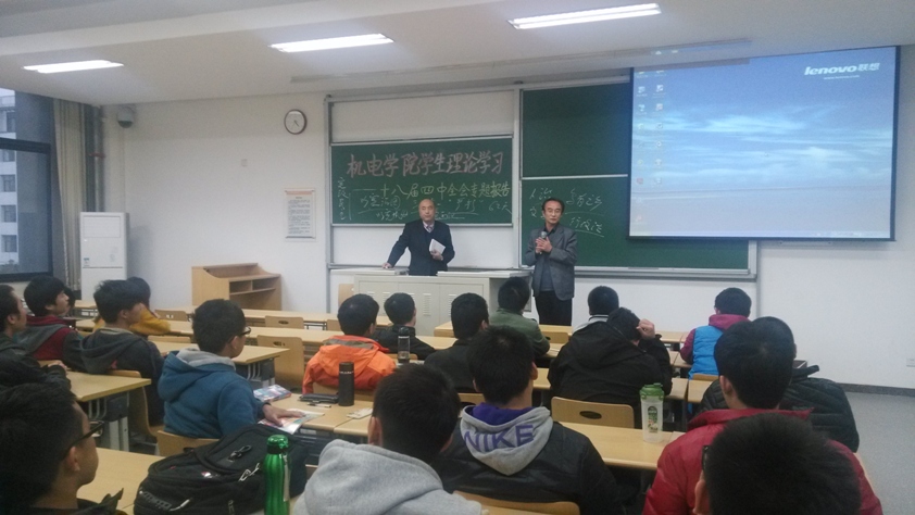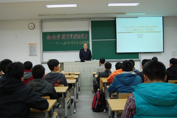 11月27日下午,机电学院邀请文法学院院长孙希磊教授,为学生党员和入党积极分子做了十八届四中全会精神的专题辅导报告。学院党委书记王跃进、副书记汪长征、本科生第二党支部书记曾祥渭参加报告会。