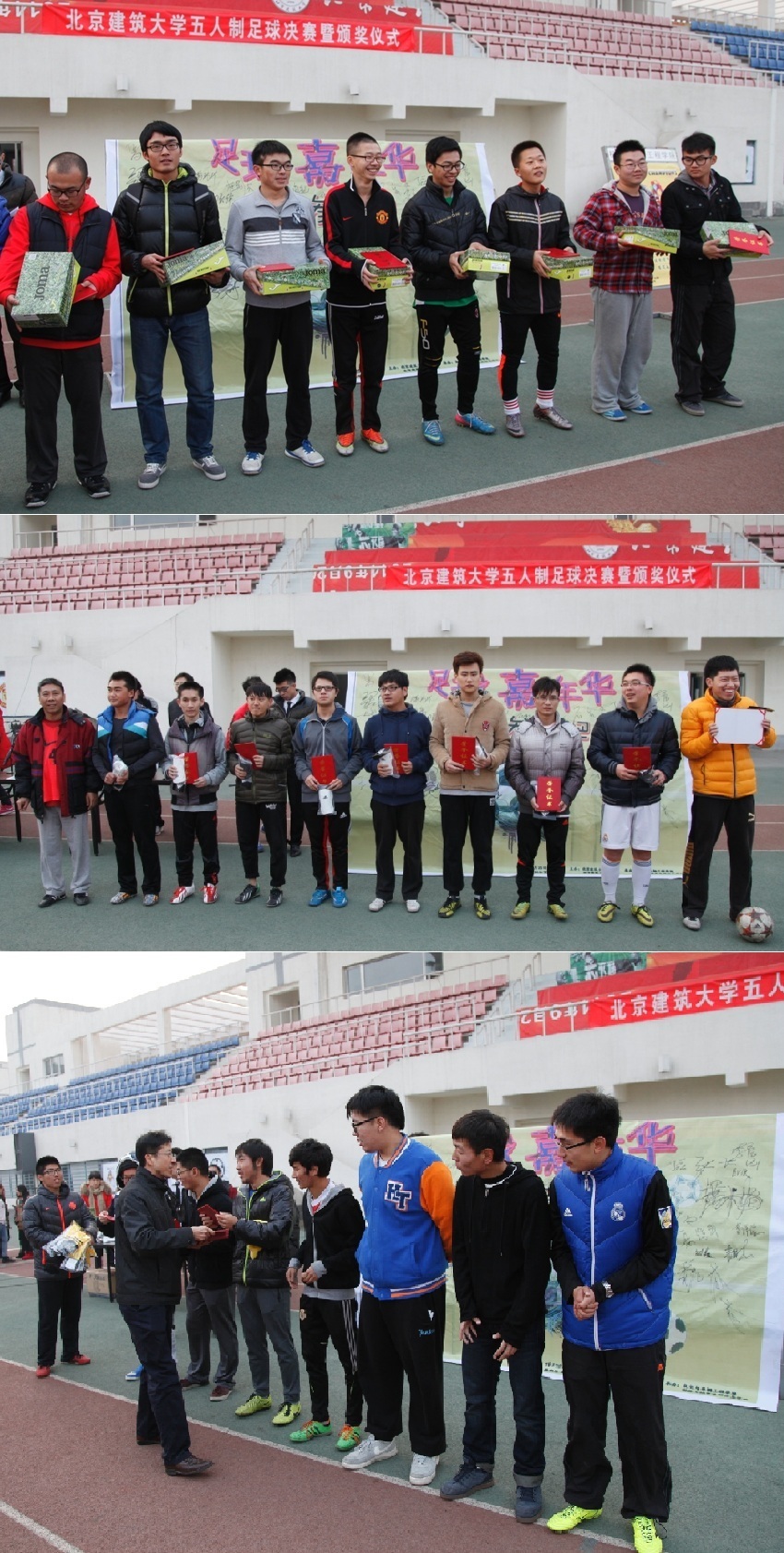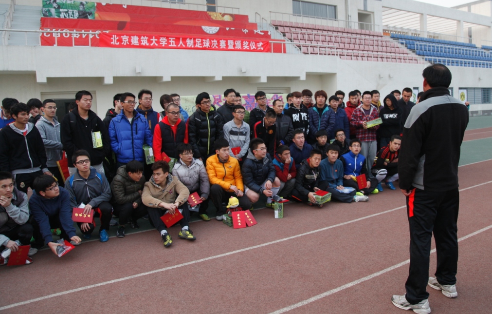 体育部部长杨慈洲、大兴校区后勤办公室主任邵永顺、学生工作部副部长冯永龙、机电学院党委副书记汪长征等参加了颁奖典礼。颁奖典礼后,全体参赛队员共同承诺:“走下网络、走出宿舍、走向操场,积极锻炼身体,远离网络游戏。从自身做起,践行三走精神,每天坚持锻炼一小时,为今后的良好体质而努力!”。体育部杨慈洲部长在总结发言中表示,我校历来就有足球运动的传统,在历史上也是足球强队,本次五人制足球赛再次掀起了学校足球运动的热潮,为我校大力发展校园足球、建设高校高水平足球队做出了表率和榜样。