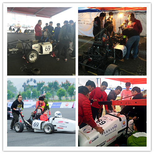 比赛的几天天气都不太好,但雨并没有浇灭团队的热情,大家各自进行手中的任务,丝毫不肯松懈,即便都冻得微微颤抖,也毫无抱怨专心致志。因团队参赛人数相比其他车队略显劣势,所以每个人的工作量都相当大。车检环节中队员们马不停蹄地抢修一直到深夜,成功通过了三项车检,然而由于一些技术细节有失完美,还是遗憾地失去了动态比赛的参赛机会。在艰苦的环境和强劲的对手面前,同学们依然脚踏实地努力,将自己做到最好,不断找寻差距、吸取经验。