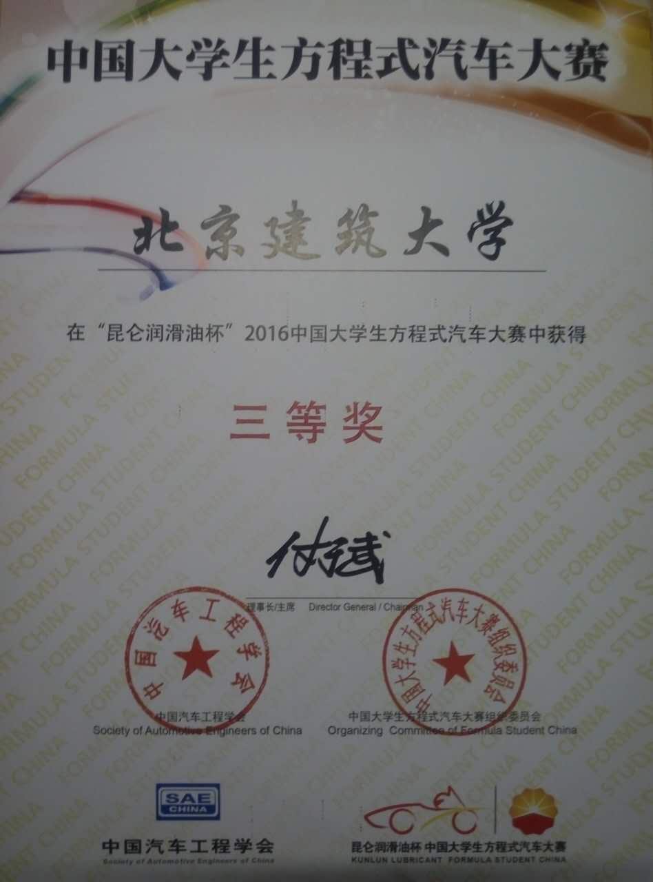 我校方程式车队在代表我校参加的2016年全国大学生方程式汽车大赛(FSC)中,获得了三等奖的好成绩。