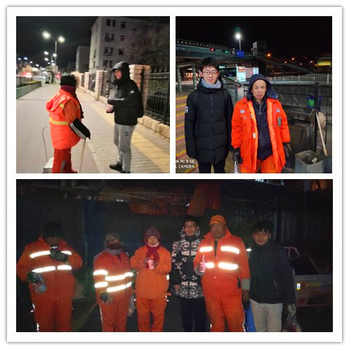2018年12月29日凌晨五点半,天色朦胧, 机电学院组织志愿者们来到黄村西大街大兴人民医院附近,给已经踏上工作岗位的环卫工人们送去冬日的温暖。
