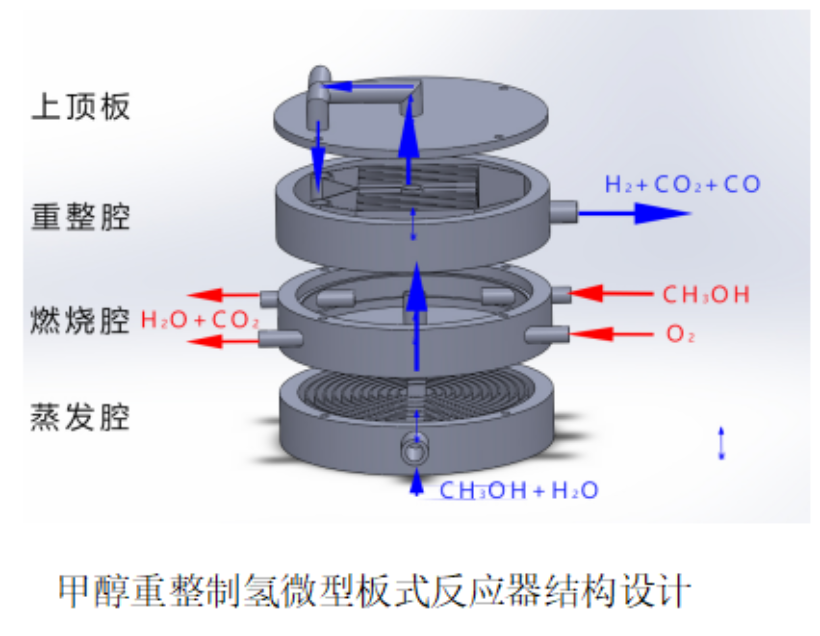 2、本作品所采用的板式反应器结构紧凑、体积小、效率高、组装操作简单、可以通过增加反应器层数以扩大反应器功率,同时可实现移动式制氢,避免氢气在运输中发生意外爆炸事件的发生。