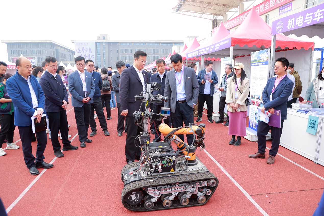 北京建筑大学党委书记郑宇,党委副书记、校长张大玉等领导来到机电学院展区,与学院党委书记李大伟,院长王衍学亲切交流,并驻足观看无人巡检作业车,对其功能和性能展现出浓厚兴趣。