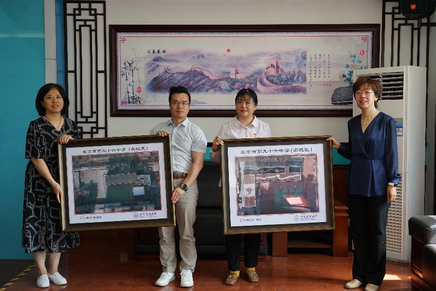授牌仪式上,李大伟书记向北京第九十六中学授予“优质生源基地”牌匾,黄鹤赠与了九十六中校园遥感影像图,两校领导教师共同见证这一重要时刻。
