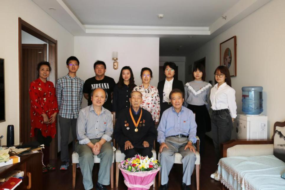 2020年9月26日,离退休工作办公室主任赵静野、机关退休第二党支部书记吴家钰、校产退休党支部书记曲秀丽、机电学院本科生第一党支部书记高静、辅导员万璟瑶以及学生代表共同看望抗美援朝老战士张希贤前辈。