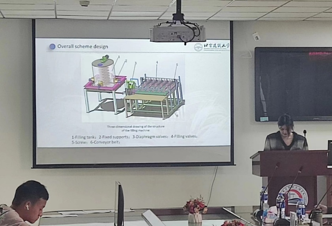 四号选手刘亚,她的演讲题目是“Viscous liquid canning device”。刘亚针对粘稠液体装罐设备的工作原理进行了详细的阐述,也结合实际的应用场景进行了分析,得到了老师的好评和鼓励。