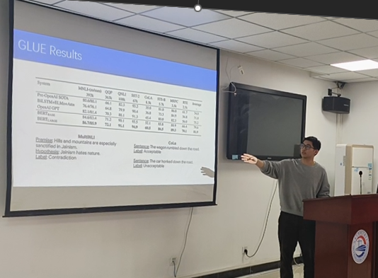 二号选手同学韩晋阳,他的演讲题目是“BERT Algorithm: A Breakthrough in Natural Language Understanding”,PPT从多个角度深度分析了BERT模型,展现了自己庞大的知识和英语专业词汇储备。