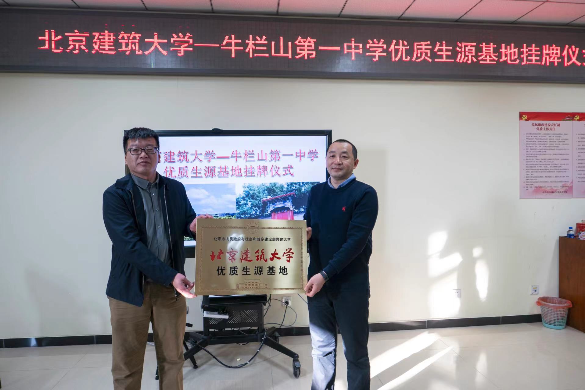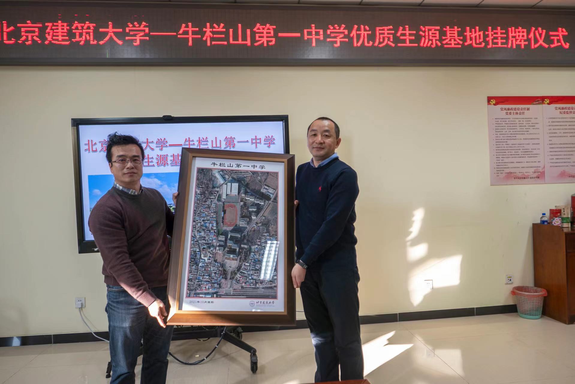 李大伟向牛栏山一中授予“优质生源基地”牌匾,黄鹤向牛栏山一中赠予校园遥感卫星影像图。