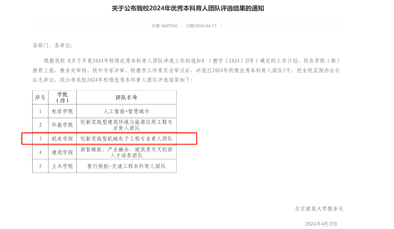 近日,学校下发了《关于公布我校2024年优秀本科育人团队评选结果的通知》(教字〔2024〕63号),我院创新实践型机械电子工程专业育人团队获评2024年校级优秀本科育人团队。