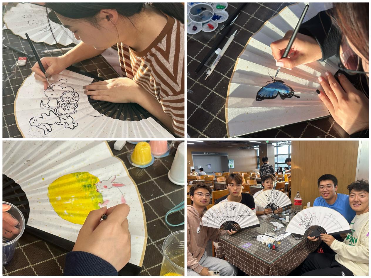 在等待月饼烤制的过程中,现场同学通过绘扇面来感受浓浓的中秋之情,一把把同学们绘制的扇子寄托了一片相思与美好,也给伟大的祖国送上了深深的祝福。
