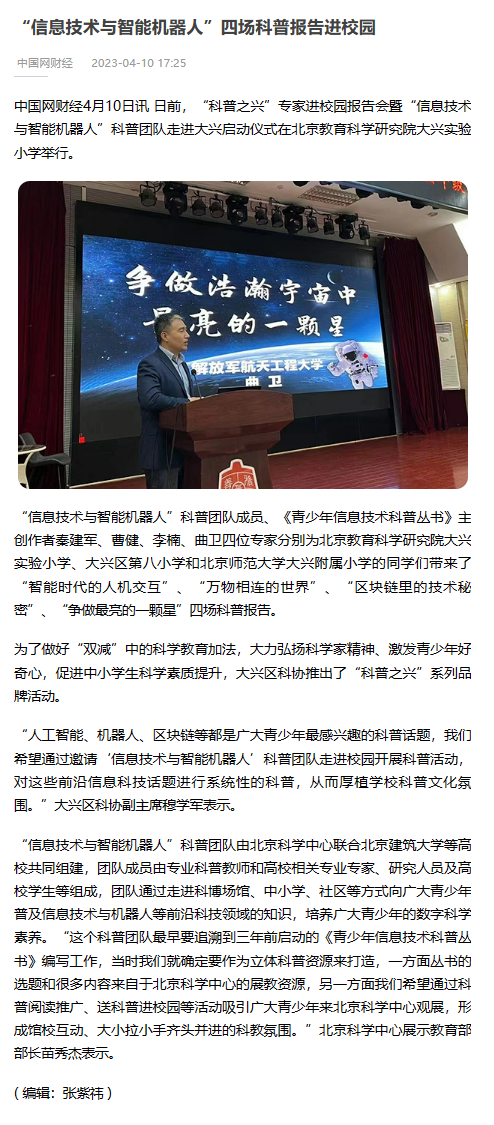 启动仪式结束后,“信息技术与智能机器人”科普团队成员、《青少年信息技术科普丛书》主创作者秦建军、曹健、李楠、曲卫四位专家分别为北京教育科学研究院大兴实验小学、大兴区第八小学和北京师范大学大兴附属小学的同学们带来了“智能时代的人机交互”、“万物相连的世界”、“区块链里的技术秘密”、“争做最亮的一颗星”四场科普报告。