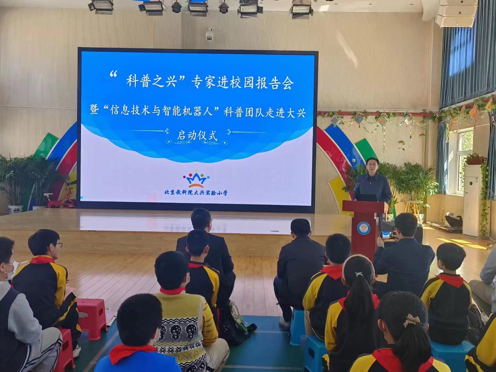 4月7日下午,“科普之兴”专家进校园报告会暨“信息技术与智能机器人”科普团队走进大兴启动仪式在北京教育科学研究院大兴实验小学举行,活动由北京科学中心、北京建筑大学和北京大兴区科学技术协会等联合主办。