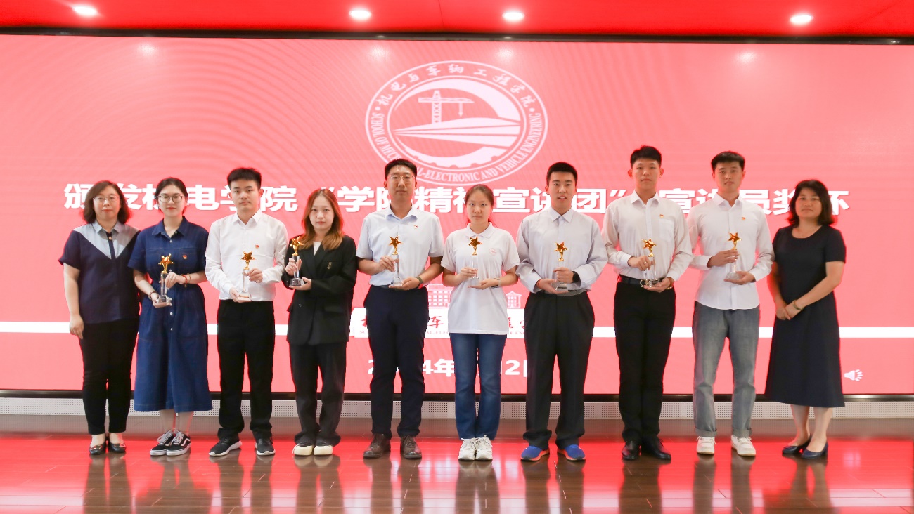 卫巍和朱俊玲为8位师生宣讲员颁发机电学院“学院精神宣讲团” 宣讲员奖杯。